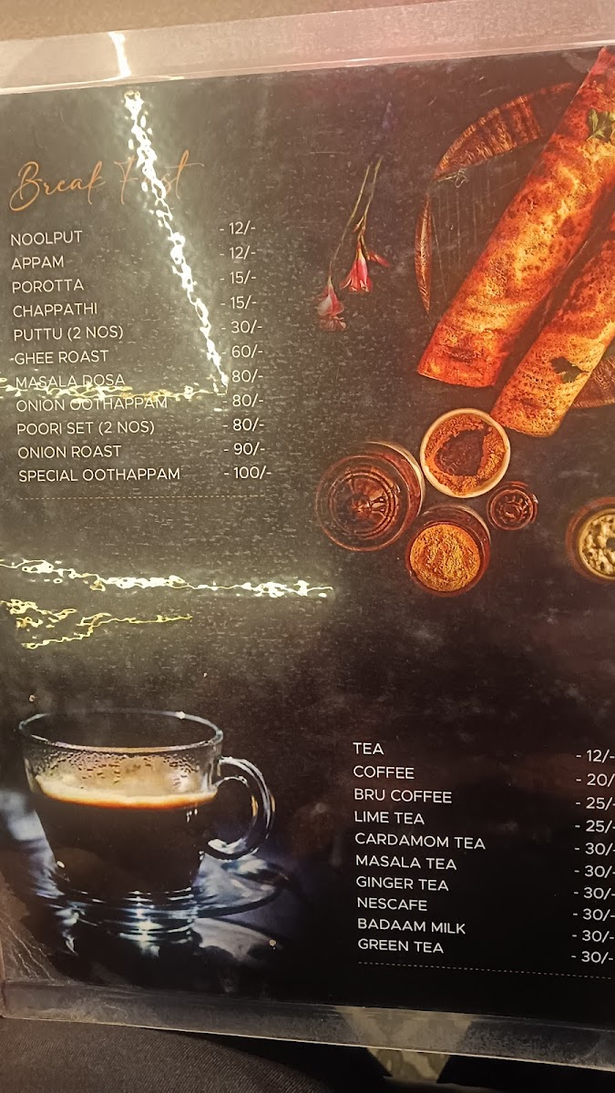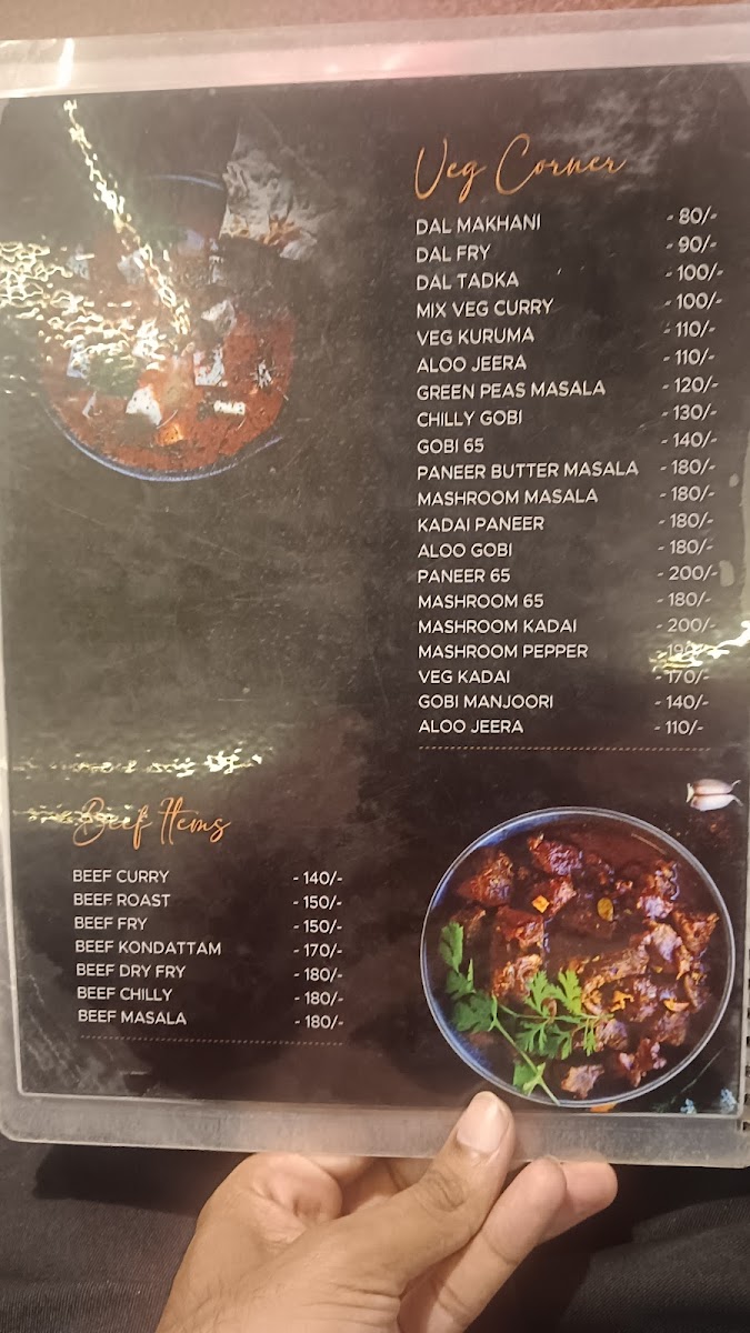 The menu features a delightful array of options, showcasing the rich flavors of Kerala. Start your culinary journey with their delicious salads like the Beetroot Salad or Cucumber Salad, expertly crafted to refresh your palate for just ₹90. The café also serves an impressive selection of breads, including Noolput, Appam, and Ghee Roast, all priced at an affordable ₹90. For a truly traditional experience, don't miss the Koth Poratta Chicken or Kizhi Poratta Beef, both hearty and indulgent dishes that capture the essence of Kerala's culinary heritage, each available for just ₹150.